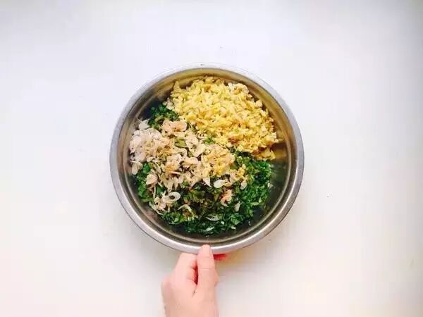 1.先做饺子馅儿,韭菜切碎,加炒熟的鸡蛋,把所有材料加到一起,拌匀。