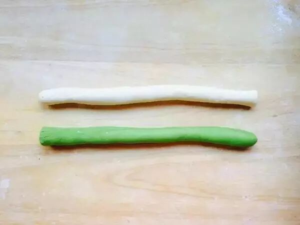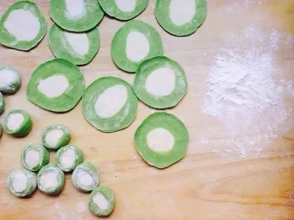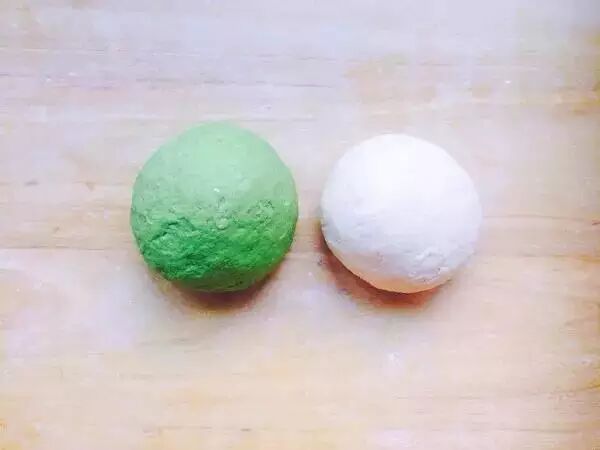 3.一份面粉加菠菜汁和成绿色的面,一份面粉加清水和成白色的面。