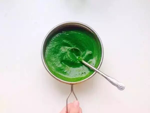 2.把菠菜烫熟,加少许水放进料理机搅碎,过滤出汁。