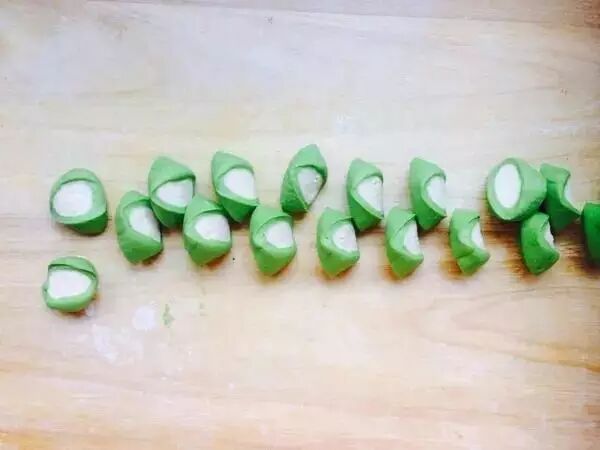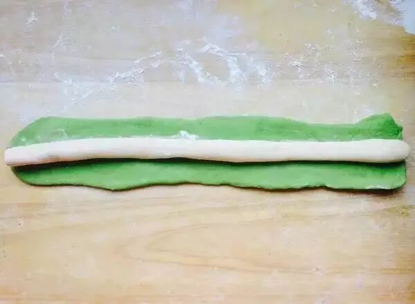 5.把绿色的擀平,包住白色的,封口要对齐。