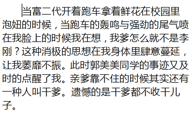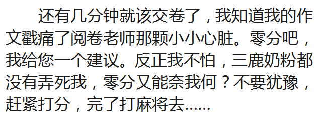 说 尺 子 从100分到98分,挨一顿揍;从55分到61分,得一个吻。这看似荒诞不经的故事,却常常发生在我们身边,许多人看来,前者退步了挨揍是天经地义,后者进步了得吻是理所当然。 我们常说,要一把尺子量到底。在现实生活中,应当说尺子是最公平的,但拿在不同人的手里,去度量不同的人,就会出现不同的结果。我们习惯了妈妈在厨房中的忙碌,一日三餐总是准时吃到可口的饭菜,可当有一天,我们回家面对着干锅冷灶的时候,却首先想到的是无饭可吃,沮丧之余,面露愠色,甚至开口责备,完全忽略了她累了病了,撑不住了,连烧口开水的力气也没有了;而我们的爸爸偶尔下一次厨房,煮一碗面,却能让一家人感到万分知足。惯性,使我们的尺子变得富有弹性,却无法丈量出爱的深远。 每个单位都良莠不齐,有干的有看的,也有捣乱的,总有一些秃子混在和尚之中滥竽充数。奇怪的是干的永远在干,看的一直在看,而干得越多失误也越多,得到的批评也越多,而那些看客,偶尔偷机取巧做做样子,就会名利双收。甚至那些捣乱的,变得乖巧一些,就会让领导和一席众人皆大欢喜,心满意足。惰性,使我们的尺子带了偏见,就再也无法凝聚众人的力量。 大家还记得北方小城那位舍粥的大嫂吗?每到冬天她就半夜起来,熬上满满的三锅热粥,免费送给寒风中瑟缩的清洁工、穷苦人和乞丐,数年如一日,不曾间断。而当有一天,一位老汉从中吃出了一粒沙子,顿时将一碗热粥泼在大嫂的身上,而领粥的人,也瞬间划分为两大阵营:有人说老汉不该撒野,也有人指责大嫂不该掺沙子。薄情,让我们的尺子扭曲,冷了多少善良的心。 开县一辆满载了19名乘客的中巴,突遇险情,一头栽进深达五米的水塘。当地村民金有树跳进冰冷刺骨的水中,砸开车窗将19名乘客全部救出,自己却因长时间冷水的浸泡患上肺病,举债治疗数月,告借无门,不得不离开医院,病死家中。19名幸存者无一人去医院探视,更无人为他送行。金有树临死前写下一封信,第一句话就是:“我救了19人的命,现在谁来救我的命。”冷漠,让我们的尺子訇然寸断,留下无尽的遗憾。 每个人心里都有一把尺子。我们用它来衡量别人,更要时常度量自己。这个世界,应当有这样一把尺子,于情充满温暖,于理凸显公平,于法彰显正义,时时刻刻闪耀着人性的光辉。只要坚持从我做起,从一点一滴做起,苛责自我,宽厚待人,星星之火,势必燎原,人间终会洒满阳光,洒满爱。 读后语:一个十八岁的髙中生能写出如此令人震撼的文章,深感钦佩!实乃后生可畏,民族之幸也!